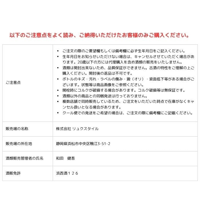 【ご注意】 ・ ご注文の際のご要望欄もしくは備考欄に必ず生年月日をご記入ください。 ・ 生年月日をお知らせいただけない場合は、キャンセルさせていただく場合があります。20歳以下の方には代理購入を含め酒類の販売をいたしません。 ・ 酒類は開封出来ないため、品質保証ができません。古酒の特性をご理解の上ご購入ください。開封後の返品は不可です。 ・ ボトルのキズ・汚れ・ラベルの傷み・澱(オリ)・液面低下等がある場合がございます。状態等は商品画像をご参照ください。 ・ 開栓時にコルクが破損する場合があります。コルク破損等は無保証です。 ・ 酒類以外の商品との同梱発送は行っておりません。 ・ 複数店舗で同時販売しているため、ご注文をいただいた時点で在庫がなくキャンセル扱いとなる場合があります。 ・ クール便での発送をご希望の場合は、ご注文の際に備考欄にご記載ください。 販売場の名称: 株式会社リュクスタイル 販売場の所在地: 浜松市中央区鴨江3-51-2 酒類販売管理者の氏名: 和田 健吾 酒類免許: 浜西酒126